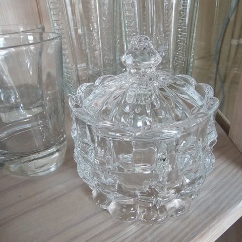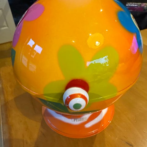 Fargerik Pylones skål/boks i metall med lokk som svinges opp. Fin til småsaker på badet, barnerommet etc.