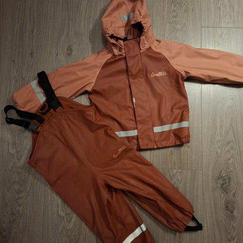 Praktisk regntøysett med matchende jakke og bukser i slitesterkt materiale for barn.