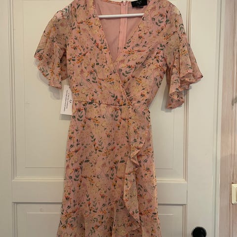 Nydelig kjole. Ny, kun prøvd på. Fin fasong og lekre detaljer. Fargen heter Adobe rose. Se bilde for målene på kjolen.