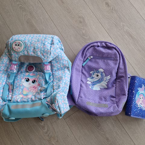 Selger fint brukt skolesekk til skolestart. Mye bruk igjen. Sekken passer til 1-3 klasse. Blinkende lys for bedre synlighet i mørket, regntrekk, utskiftbare merker og en liten minisekk til oppbevaring av merkene.