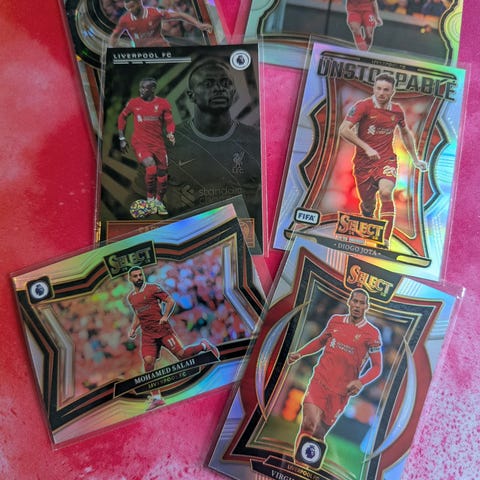 Mange ulike fotballkort av Mohamed Salah i Liverpool drakt selges.