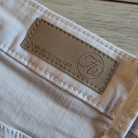 Fin hvit italienskprodusert jeans i en tett og glattvevd, litt elastisk bomullsblanding selges. Stoffet består av 64 % tenctel, 34 % bomull og 2 % elasthan. Modellen heter Susan-Su. Buksen har jukselommer foran, som er lukket med glidelås, og bak. Ekstra langsgående sømmer går fra lommene foran. Buksen er brukt en gang, den selges vasket.