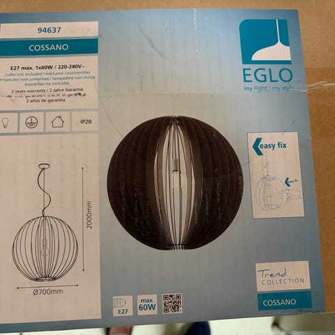 Eglo Cossano pendellampe i tre. Lampen har en rund, åpen skjerm bestående av buede trelameller og er beregnet for montering i tak. Den bruker standard pære med E27-sokkel (ikke inkludert) og er egnet som allmennbelysning over bord, i stue, kjøkken eller andre oppholdsrom. Modellen har «easy fix»-løsning for montering i takkopp og kan brukes med ulike typer lyskilder som er kompatible med E27-sokkelen.
