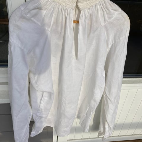 Nysydd skjorte i bomullssateng til bunad/festdrakt 😊 Farge ecru. Puffermer, og kinakrage. Merk: ikke knapphull til mansjetter. Kan vaskes i vaskemaskinen på 40 grader, finprogram. Ubrukt.