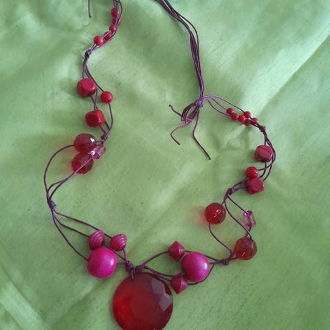 Rødt smykke med svart snor. Perlemor på baksiden. Kul retro look. Ca størrelse S.