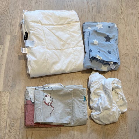 Fint sengetøy i hvit med luftballongmønster i str 65×80. Dette er størrelsen til en av de første babydynene.