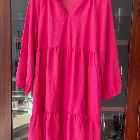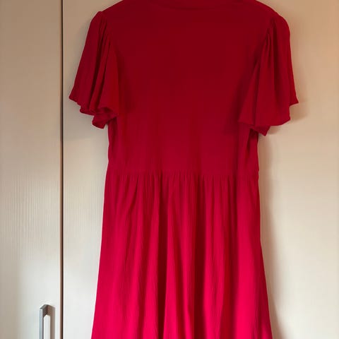 Løs og ledig minikjole fra Gina Tricot i størrelse 36. Kjolen har rund halsåpning, knappelukking bak i nakken, og korte ermer med volanger. Fargen lener noe mot korallrød tror jeg. Veldig frisk rødfarge, perfekt som sommerkjole.
