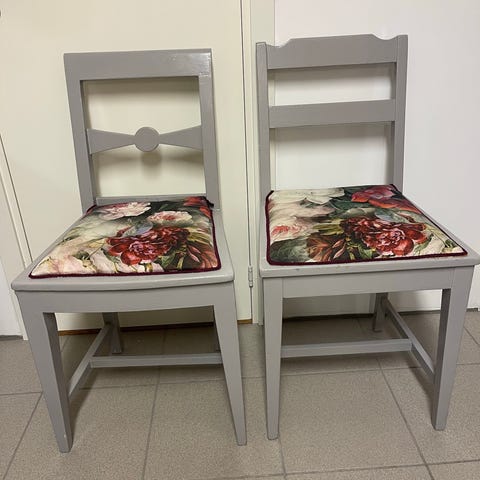 Selger 2 stk pent brukte unike vintage stoler som er trukket med stoff fra Designers Guild. Masse fine detaljer, se bilder.