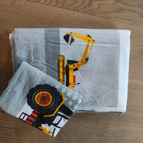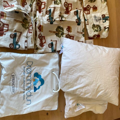 Selger veldig lite brukt sengekant og sengetøy med traktorer og anleggsmaskiner. Alt ble sydd på bestlling og passer til seng i str. 120×60 cm.