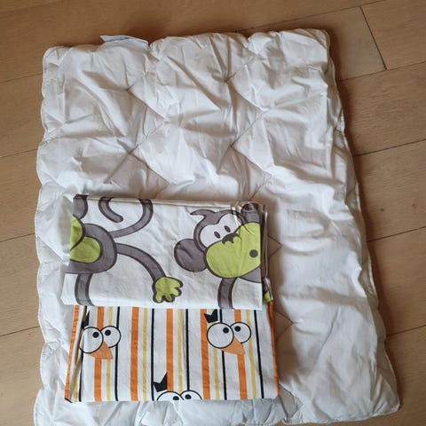 Det følger med en teppe, putetrekk med glidelås, dynetrekk med glidelås, laken med strikk og sengekant.