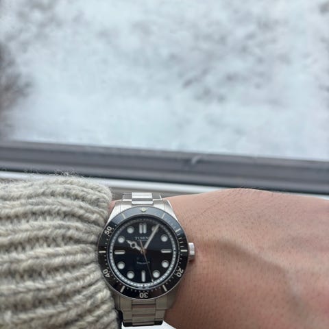 Den er lett og fin på armen. Siden den ikke er større enn 39mm så passer den også på slanke håndledd. Skiven er samtidig såpass stor siden klokken har så slank bezel.