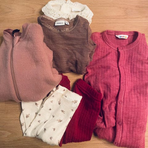 Joha ulldress er i str 68-74 og passer til str 80. Ullsokker er veldig varm.