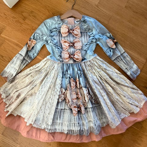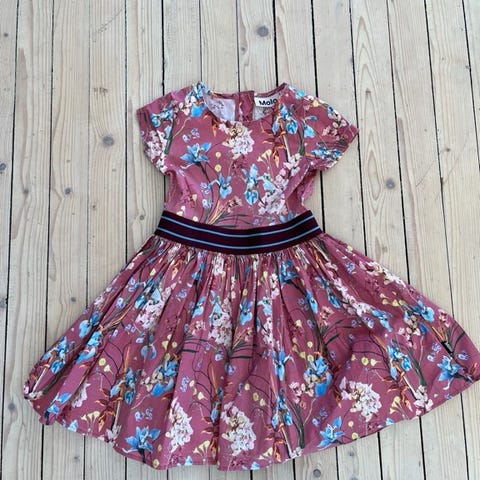 Selger kjole fra Molo som er som ny. Ferskenfarget overdel. Store fargerike blomster og fugler på skjørtet.