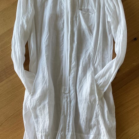 Flott, lang kjole i 100% lin. Lommer i sidene og avrundet splitt på hver side nederst. Belte følger med. Kjolen er helt ny. Ny pris er 1900,-