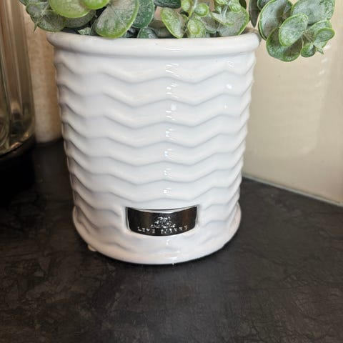 Blomsterkrukke i sølv fra Lene Bjerre, men logo i front.