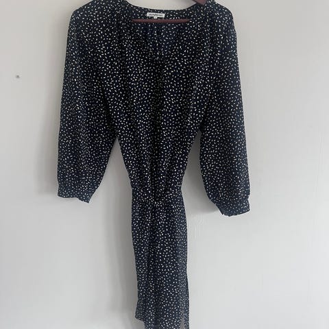 Kjolen har belte, den er sort med hvite prikker/hjerter. Kjolen er lite brukt. Armene er 3/4 lengde. Kjolen er i 100% polyester. Kjolen kan sendes.