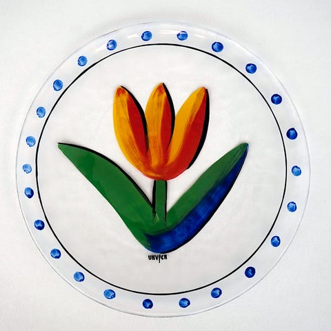 Nydelig Kosta Boda -fat, noen små bruksmerker Lekkert på vegg eller stående i fatstøtte i vindu. Tåler IKKE å bli vasket i maskin, pga. håndmalt.