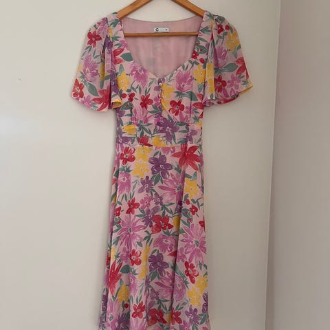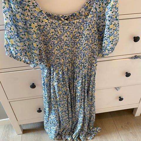 Pen kjole i størrelse 38 fra Gina Tricot. Hvit med diverse farger og blomster. Pent brukt. Se lengdemål på siste bilde. Litt slitasje med noen få sømmer som er litt løse, se bilde for illustrasjon. Hentes i Ski eller sendes mot betaling av porto.