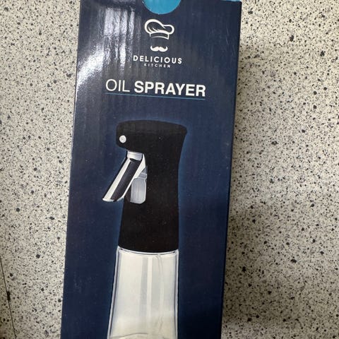 Helt ny og uåpnet oljespray flaske i glass.