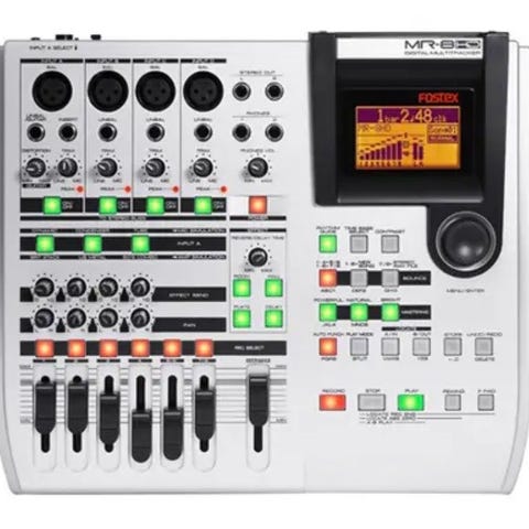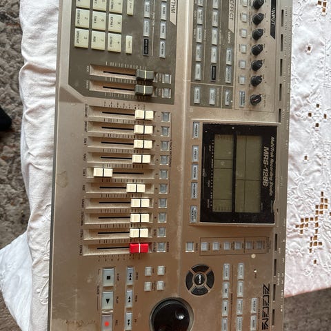Zoom MRS-1608 multitrack recorder med 16 spor for lydopptak. Enheten har flere kontrollknapper, faders og en LCD-skjerm for visning av innstillinger og sporstatus. Passer for lydopptak og miksing i studio eller live-opptakssituasjoner.