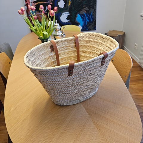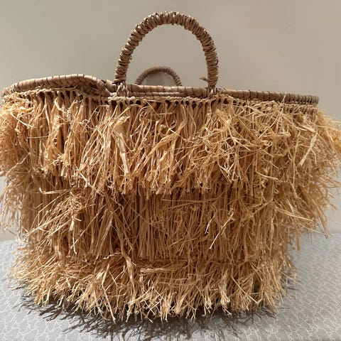 Fin strandkurv - veske med skulder remmer. Stjernemotiv med flerfargede paljetter i front. Snøring med stoff som kan ligge inni vesken - evt dekke til innhold du har med i vesken.