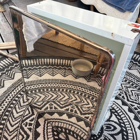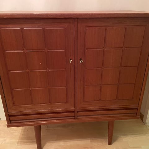 Hjørneskap i teak, med lys og speil i skapet. I god stand, selve skapet nesten uten merker. Ikke testet med lys nylig, men har fungert før skapet ble satt til lagring.