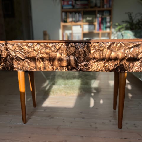 Skapet står på tilhørende bord som underdel. Men overdel er frittstående og kan dermed også plasseres på annet passende møbel i rett størrelse. Da har man i tillegg et salongbord tilgjengelig.