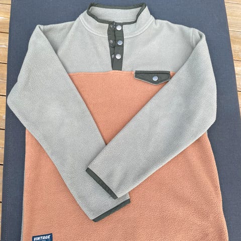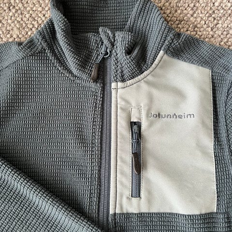 Grå fleecegenser med fine detaljer på. Str. 16 år. Selges kr. 75.-