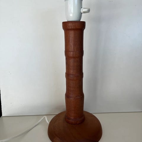 Nydelig teaklampe fra Vittsjö. «Luxus». Uten skjerm. Virker. Lang ledning med gammelt støpsel. Selges uten pære. Høyde med sokkel 42,5, D 14