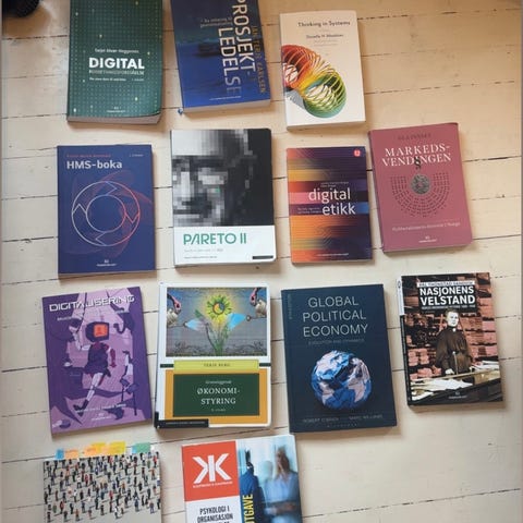 Pent brukte pensumbøker. Ingen av bøkene er markert eller skrevet i.