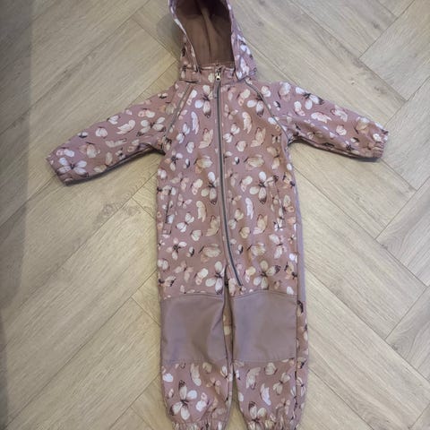 Soft Shell dress, fleece på innsiden. Synlig slitasje på knær og rumpe i form av litt flekker og nupper, men ingen hull. Litt missfarging nederst på arm og føtter. Mangler strikk under beina.
