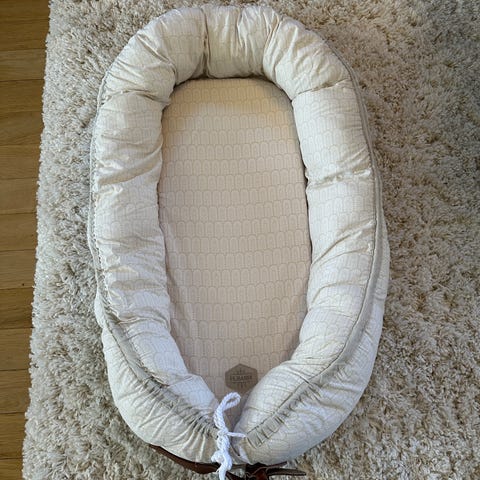 Filibabba babynest denges i fargen hvit/lys grå.