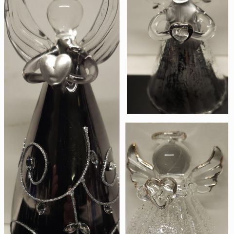Veldig fin glassengel i brunt og sølv. Ca 21,5 cm høy. Vet ikke hvor den opprinnelig kom fra, men den er nok fra 1980-tallet.