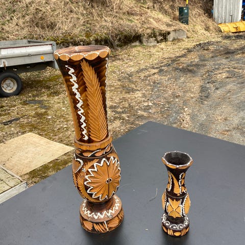 To vaser i tre , noe bruksmerker, dekorative , sender gjerne mot porto 69,- Vipps eller fiks ferdig