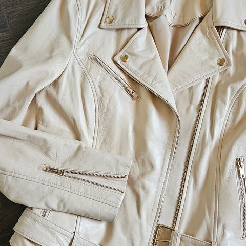 Marc Cain skinnjakke i nydelig kalveskinn. Dette er absolutt den beste skinnjakka jeg har hatt pga kvaliteten men den har blitt minimalt brukt pga vektoppgang. Den har ingen bruksmerker bortsett fra et lite kulepennmerke som er på innsiden, har ikke forsøkt å ta bort før bildene ble tatt.