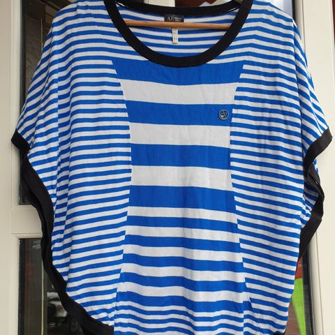 Pent og lite brukt Armani topp. Bomull,» t-shirt» stoff bak, silkeaktig trykk foran. Passer str 38-40. ( står 44 i den, antar det er italiensk str) 550kr