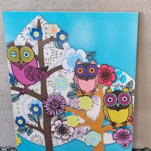 Fargerikt bilde av 3 ugler i et tre. Litt bruksmerker på et par av hjørnene, men dette vises ikke når det henger oppe på veggen.