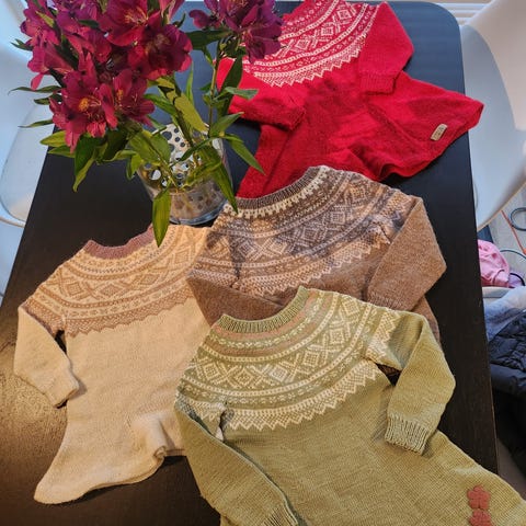Hjemmestrikket ny Varde jakke, størrelse 2 år (litt stor i størrelsen), strikket i supermyk tyn merino fra Knitting for Olive, farge perlegrå med mønster i farge snefnugg + valmueblå + granittgrå, knapper i farge matt sort.