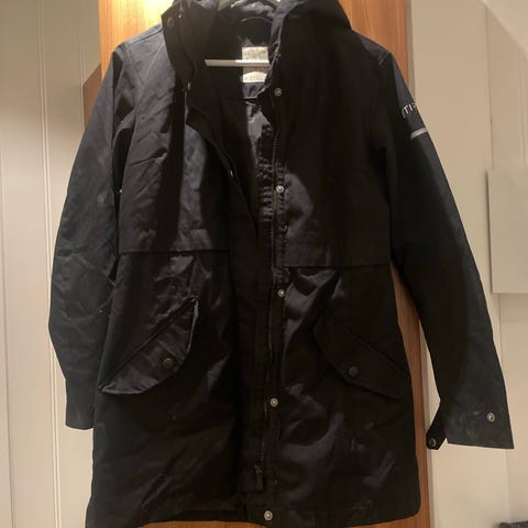 Jakken er utrolig justerbar i alle kanter, både i midje og nede. Det er mulig å justere den slik st man har en stor og romslig hette ved behov. Den er dessuten veldig praktisk hvis du kjører bil pga plassering av glidelåsen. Jakken tåler en del regn. Størrelse er 36, men passer godt for dem som bruker str. 34 (jeg gjør det selv) og det kan gjøres lett om hvis du legger på deg eller blir gravid :).