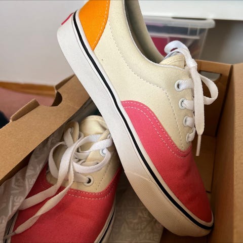 Jeg kjøpte 2 vans sko for en stund siden i 2 forskjellige farger. Jeg elsket begge, men de var for like i farge til å unnskylde seg å beholde begge. Så da går denne til noen andre. De har kun vært brukt innendørs for å prøve de på.