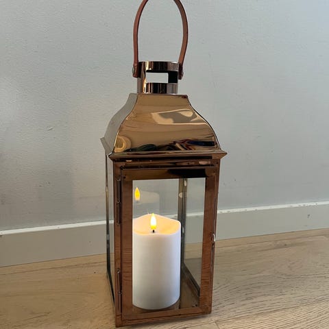 Høyden på lykten er ca 20cm og utvendig diameter er ca 22cm på det bredeste.