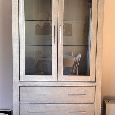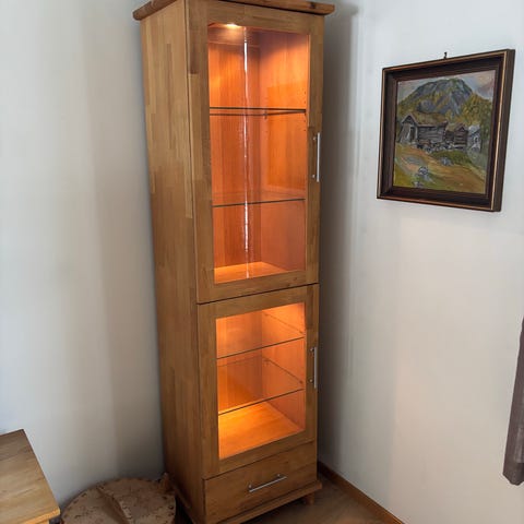 Vitrineskap fra Aannø i heltre eik selges.