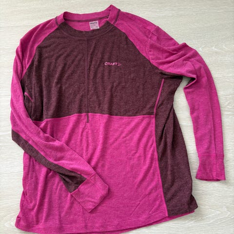 Pent brukt treningsgenser , fra svensk sportsforretning . Str 36 Fargen er rosa/lilla . Stoffet er mykt og luftig (polyester/spandex blanding) og har reflex på ryggen .
