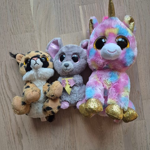 7 ty bamser i forskjellige størrelser selges. 3 av de er nøkkelringer. Den hvite har en liten flekk på seg. Noen av bamsene har barnets navn skrevet på lappen