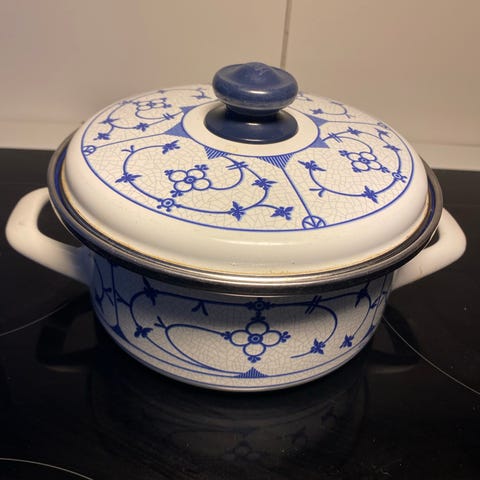 Har også en gryte med rødt lokk, i samme stil.