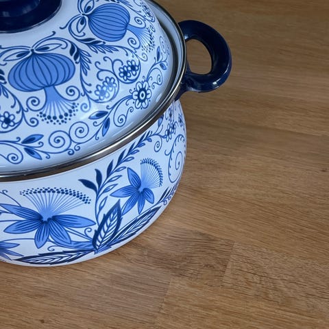 Nydelige EMALJERT Kasserolle med ett utrolig fint design, selges da den ikke brukes mer. Made in Jugoslavia. Pent brukt, nesten ingen bruksmerker.