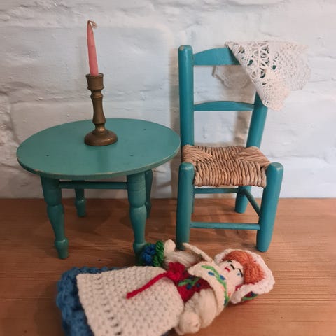 To festlige figurer .Oldemor og oldefar som sitter i hver sin stol av metall . 50 kr pr stk høyde 7,5 cm. Oldefar leser avisen og oldemor hører på.