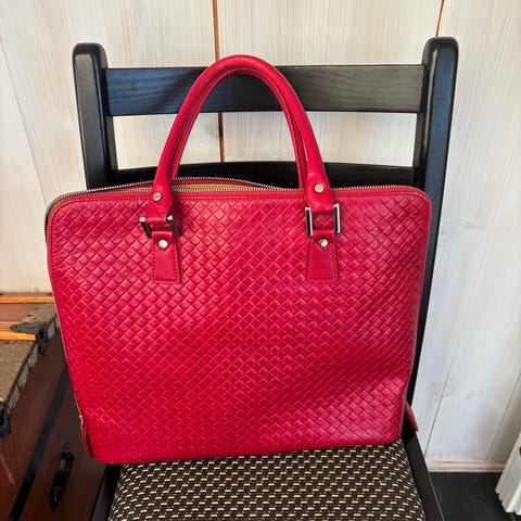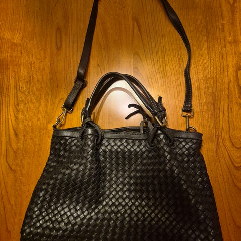 Flott skinnveske fra San Merino, Italia. Nydelig skinn, håndlaget. Tredelt brunfarge. Skulder stropp følger med. Alt i god stand. Ca. Str. bredde 30 cm. og høyde 27 cm.
