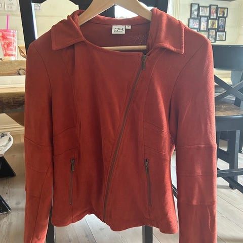 Beige jakke str 40.Passer fint str 38 også. Semska stoff .Foret m fint silkeliknende stoff , litt innsvingt Kan vaskes. 100 % polyester. Fremstår som ny.