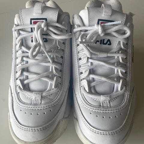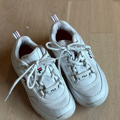 Selger hvite Fila sko i størrelse 35. Relativt små i størrelsen, vil si de er mer en 34. Brukt av et barn en sesong. Mye bruk igjen på disse fine skoene 😄